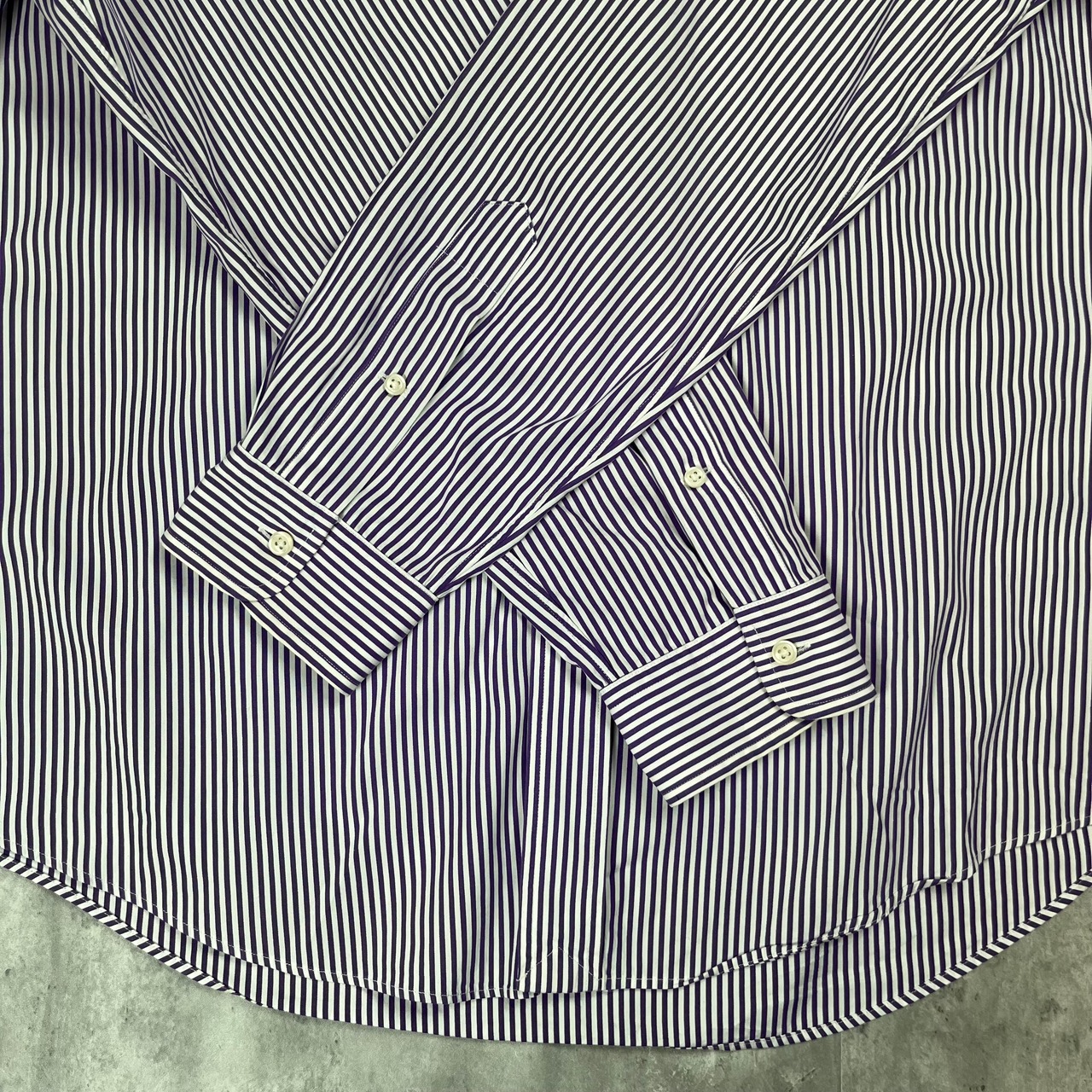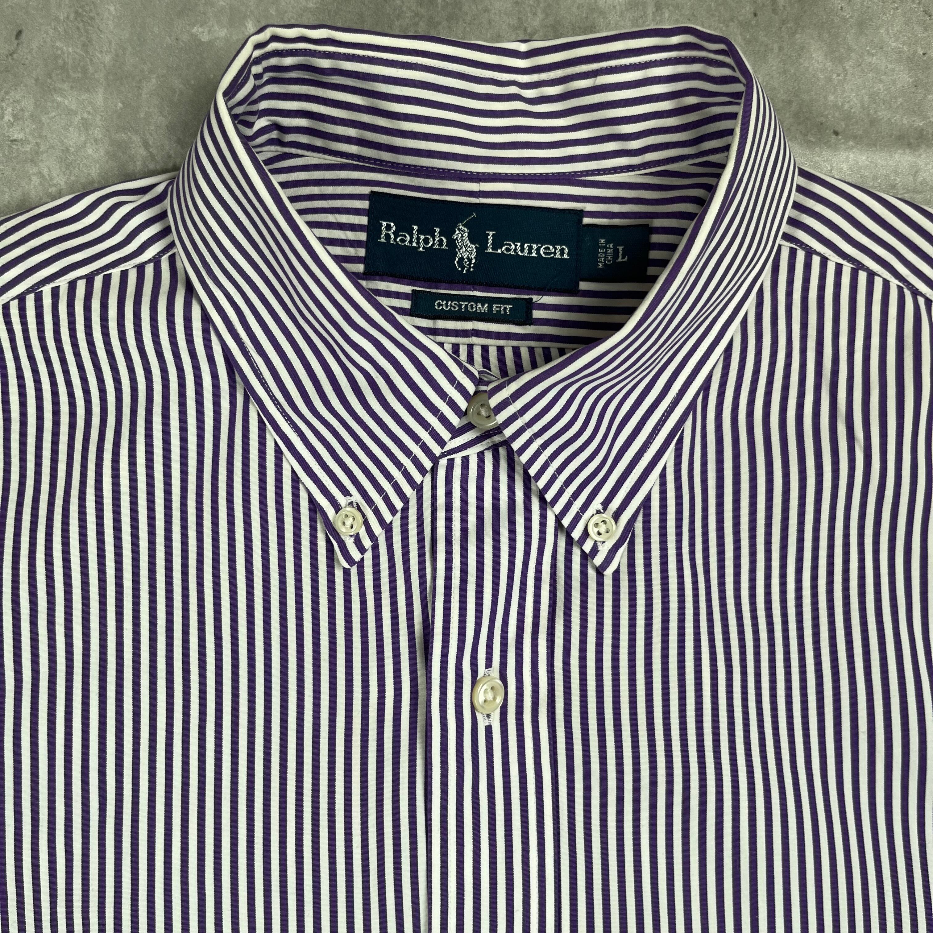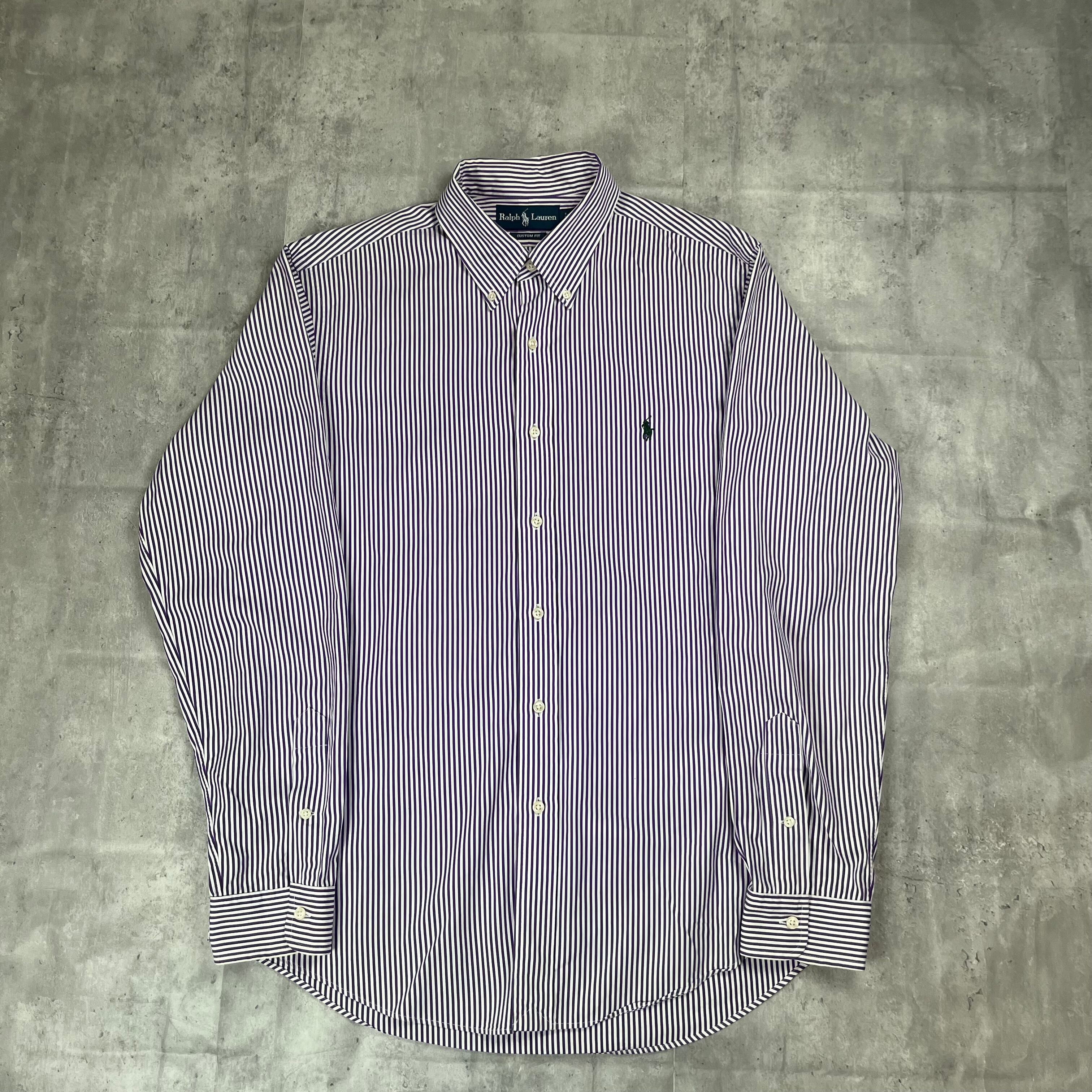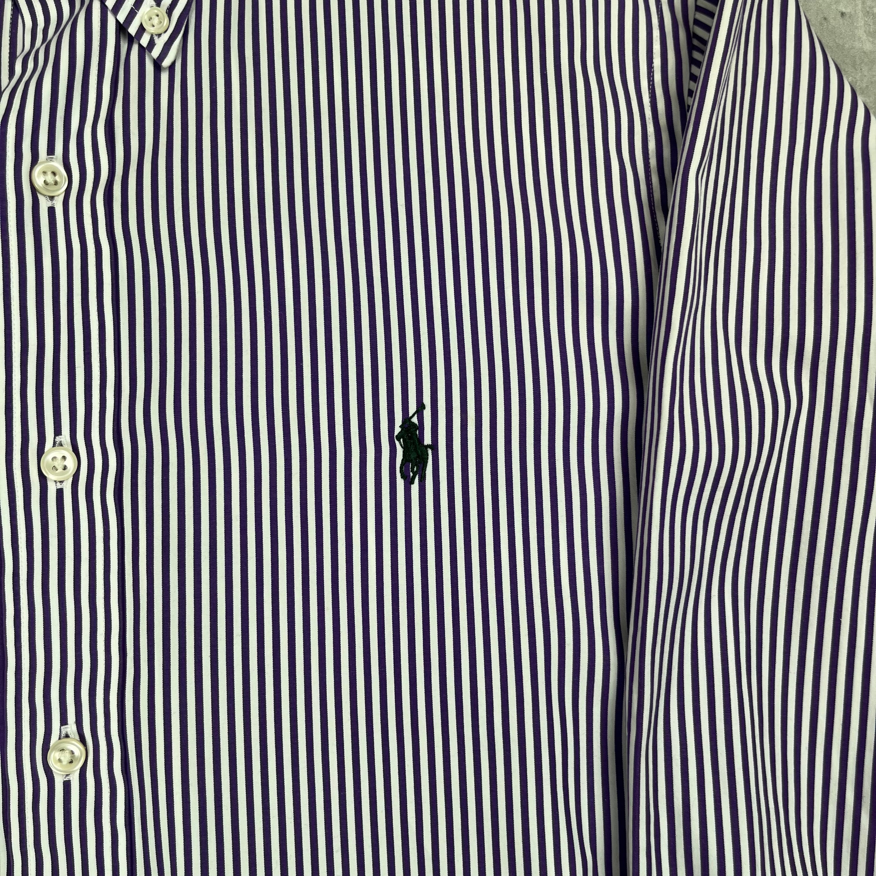 ラルフローレンの紫のストライプシャツです!ファッションにも取れ入れやすく、流行りすたりがないため、長く愛用して頂けると思います。
